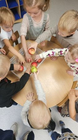 Vaikai atliko bandymus – nardė obuolius į vandenį ir stebėjo, ar jie skęsta, ar iškyla į paviršių.