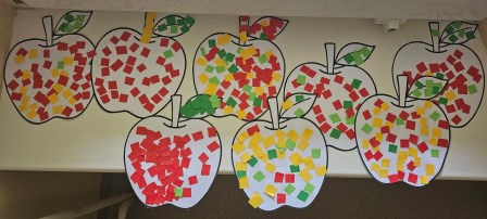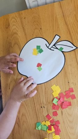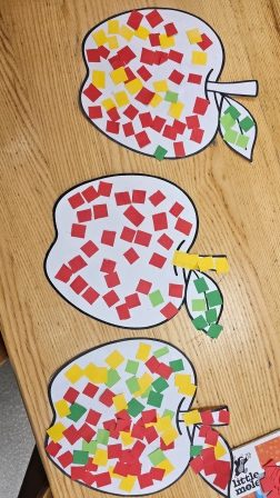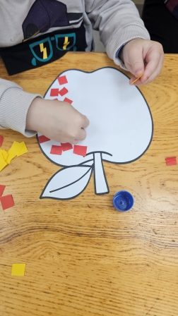 Kūrybinėje veikloje vaikai iš spalvotų popierėlių kvadratėlių klijavo mozaikas – spalvingus obuoliukus.