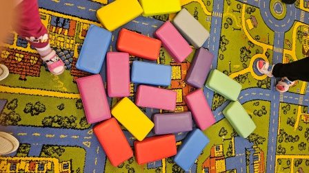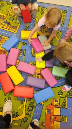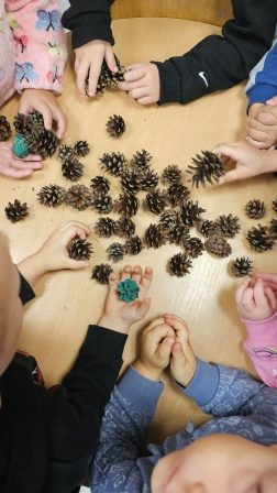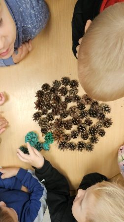 Iš kankorėžių ir minkštų spalvotų plytelių vaikai kūrė didelį obuolį – bendrą komandinį darbą.