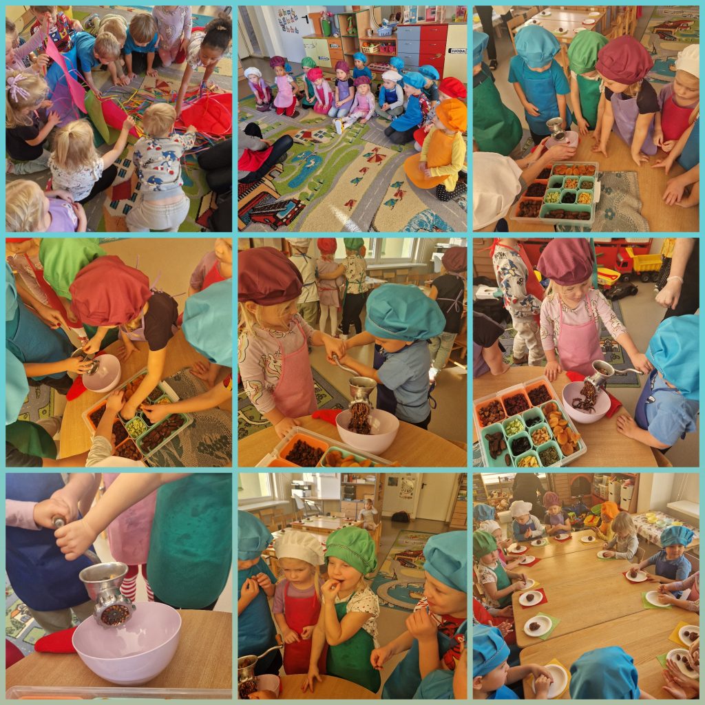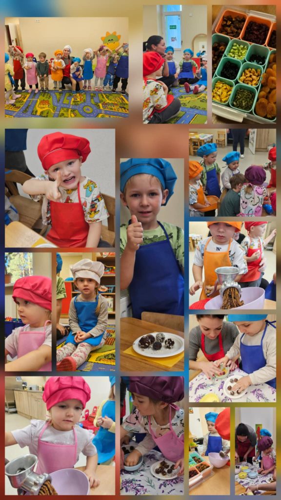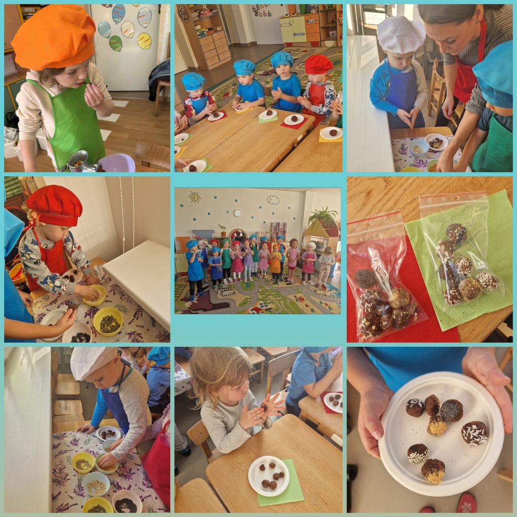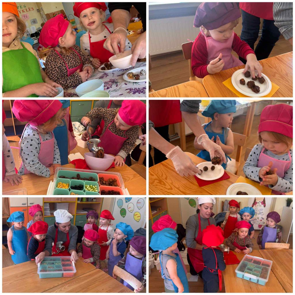 Grupėse vaikai malė mėsmale įvairius džiovintus vaisius, riešutus, ragavo gautą masę, formavo norimo dydžio rutuliukus, juos apvoliojo įvairiose drožlėse (kokoso, riešutų, cinamono ir t.t.), uogų milteliuose ir paskui buvo smagiausia dalis, tai degustacija sveikuoliškų saldainiukų.