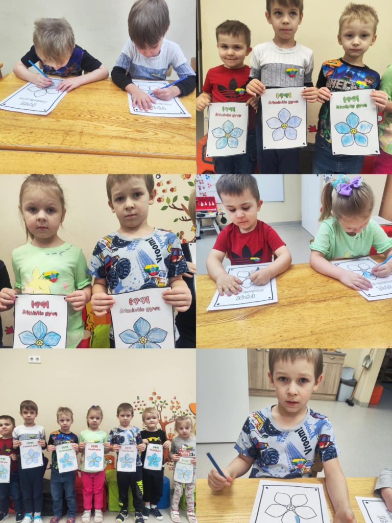 Vaikai kartu su pedagogais kalbėjosi apie Lietuvą, jos simbolius, laisvę ir draugystę. Uždegėme atminimo žvakelę – kaip šviesos, vienybės ir pagarbos simbolį. Kiekviena grupė kūrė meninius darbelius: piešė ir klijavo neužmirštuoles, spalvino trispalvę, klausėsi dainelių apie Lietuvą.